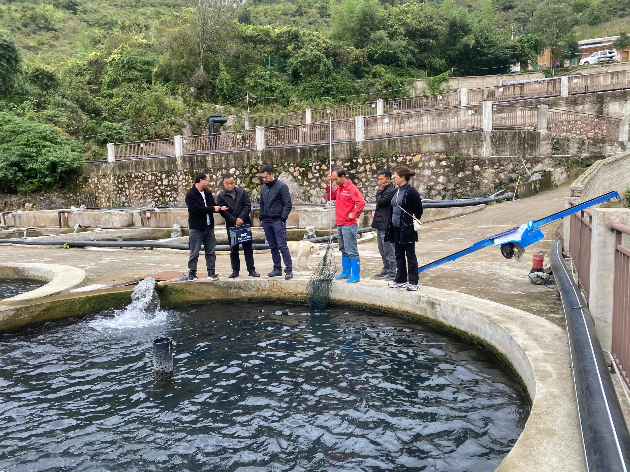 调研团队沿养殖池边走边看,仔细询问鲟鱼在不同生长阶段的养殖要点,详细了解水温控制、饲料配比、溶氧管理等关键技术环节,重点关注自然灾害、疫病爆发和市场波动对养殖户造成的潜在影响。双方工作人员不时停下脚步,与养殖场技术人员现场交流,从产业实际中寻找风险管理的切入点和创新点。