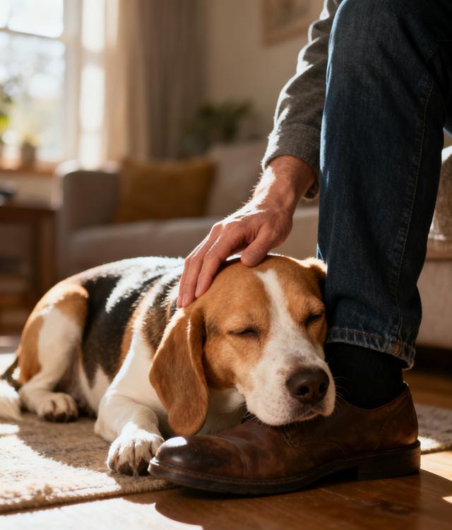 它不会吵闹,只会轻轻走到你身边,用湿乎乎的鼻子蹭蹭你的手背,再小心翼翼趴在你脚边,脑袋枕着你的裤腿。